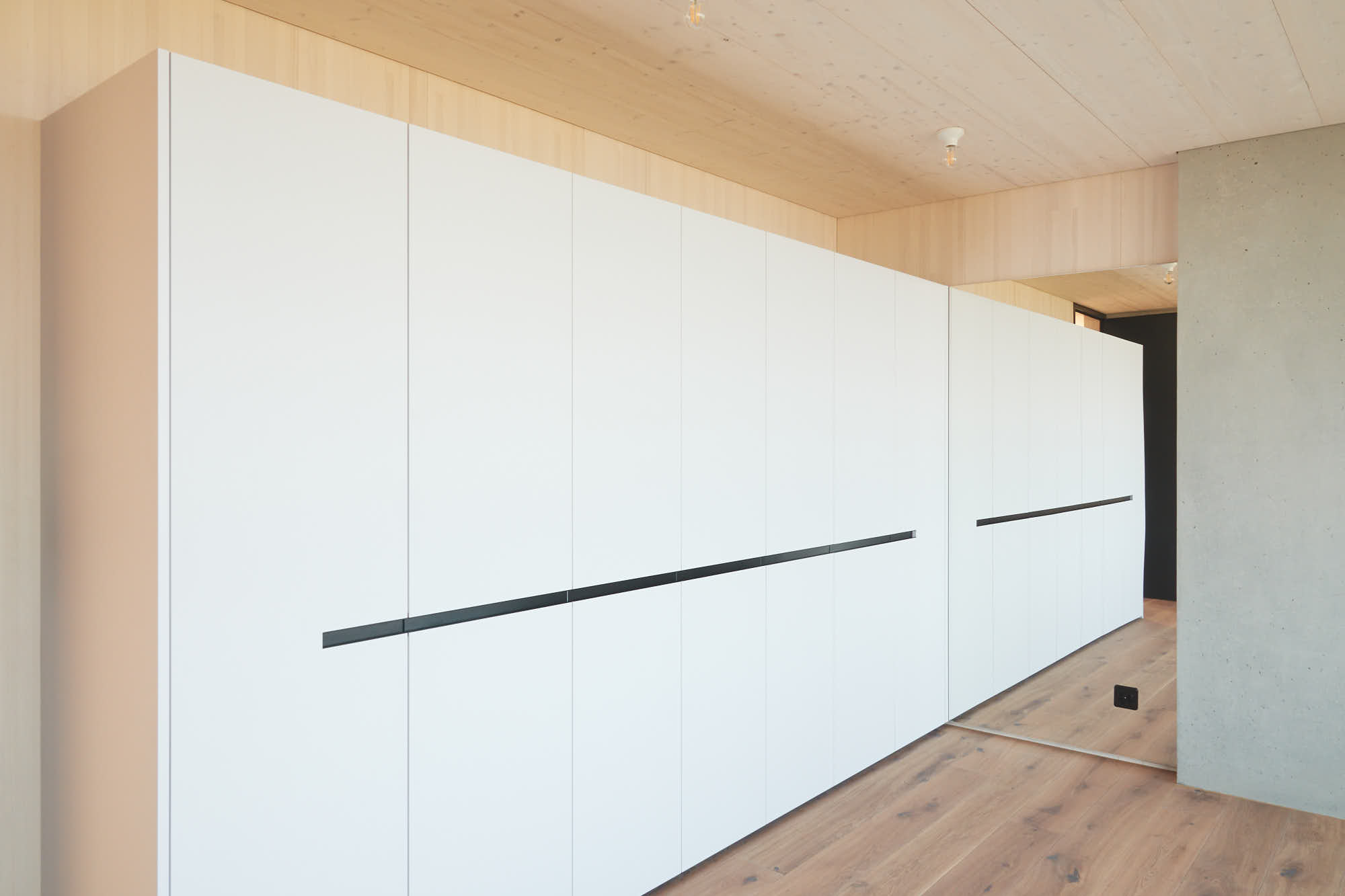 Ein Haus, das durch sein vielseitiges Raumangebot den Bewohnern Platz zur persönlichen Entfaltung bietet, aber auch Orte des Zusammenseins schafft. Unterschiedliche Fensteröffnungen ermöglichen prägnante Blicke nach aussen. Die Bedeutung des Aussenraums und der einzigartigen Landschaft manifestieren sich im gestaffelten Volumen, das durch gezielte Ausschnitte und Rücksprünge Aufenthaltsorte mit Qualitäten schafft und innen und aussen miteinander verschmelzen lassen.