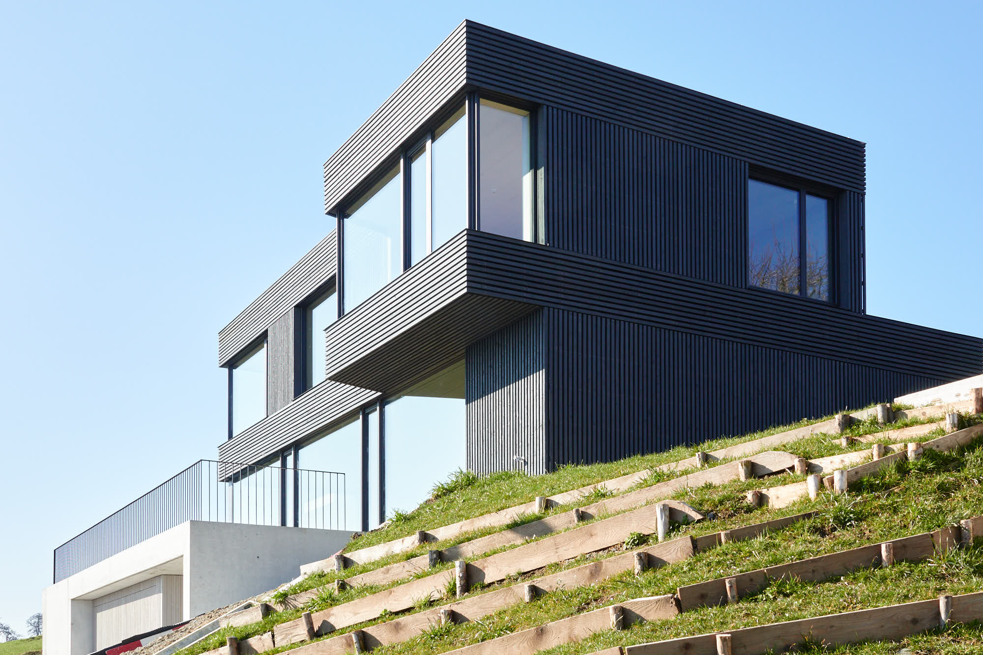 Die beinahe schwarze Fassadenschalung wurde mit einer traditionellen japanischen Methode, der «Yakisugi» (der Holzkonservierung) veredelt. Dabei wird das Holz durch leichtes Verkohlen der Oberfläche wasserabweisend und schützt vor Insekten- und Pilzbefall.